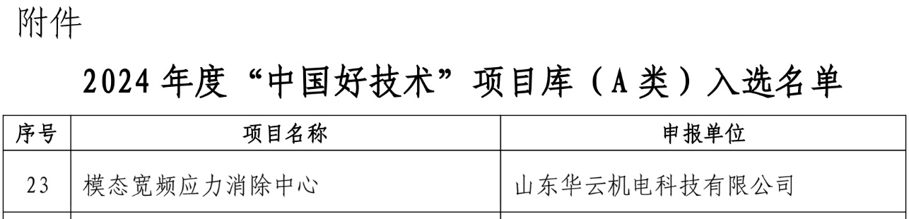 山東華云機電科技有限公司自主研發的“模態寬頻應力消除中心”榮獲“中國好技術(A類)”稱號。